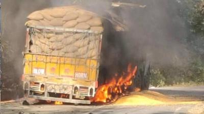 बड़ा हादसा : नेशनल हाईवे पर मक्के से लदे ट्रक में भीषण आग, यातायात ठप...जानें पूरा मामला