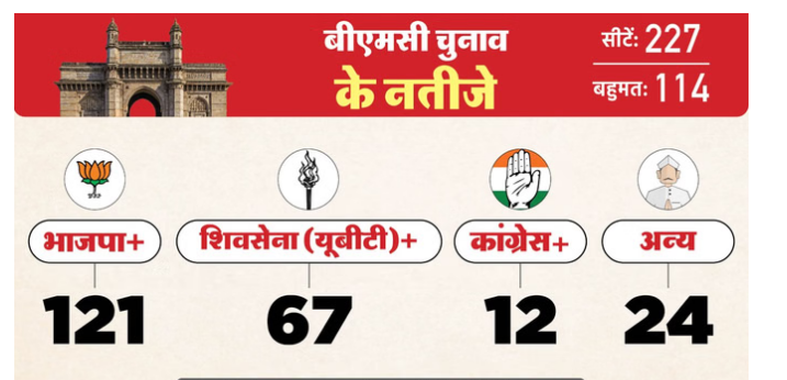 BMC रुझान: BJP+ को स्पष्ट बहुमत, 121 सीटों पर बढ़त